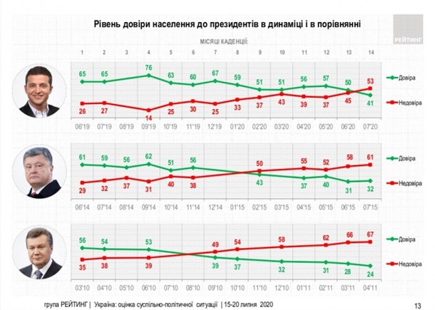 Согласно данным опроса, проведенного 15-20 июля среди 2000 респондентов, доверие к Зеленскому дольше преобладало над недоверием избирателей, чем у его предшественников.