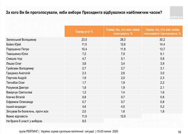 В то же время, 14,4%% опрошенных проголосовали бы на выборах за Юрия Бойко, 13,7% – за Петра Порошенко, 9,1% – за Юлию Тимошенко.
